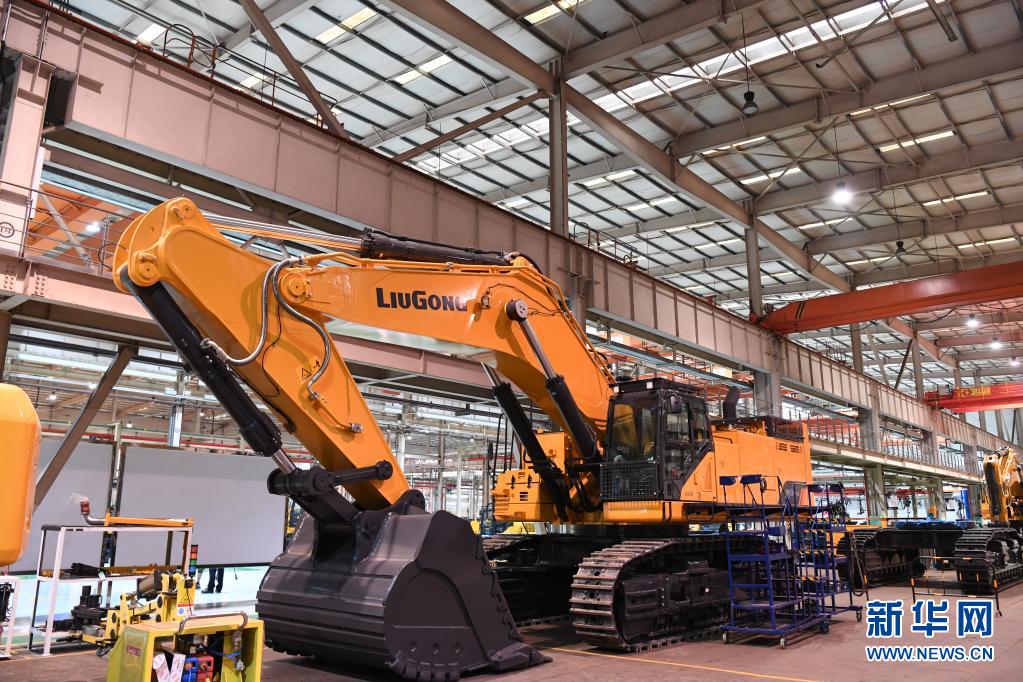 這是4月26日拍攝的廣西柳工集團(tuán)有限公司生產(chǎn)廠房?jī)?nèi)正在組裝的機(jī)械。新華社記者 曹祎銘 攝