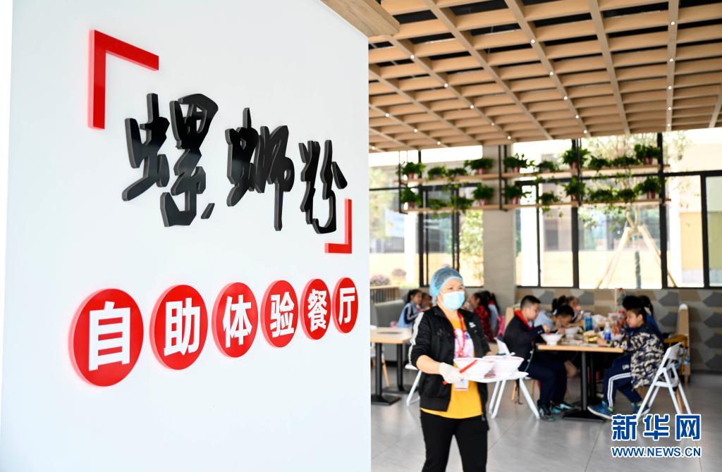 4月29日,在廣西柳州螺螄粉產(chǎn)業(yè)園,參加研學(xué)團(tuán)的學(xué)生在一家螺螄粉企業(yè)里品嘗螺螄粉。新華社發(fā)(黎寒池 攝)