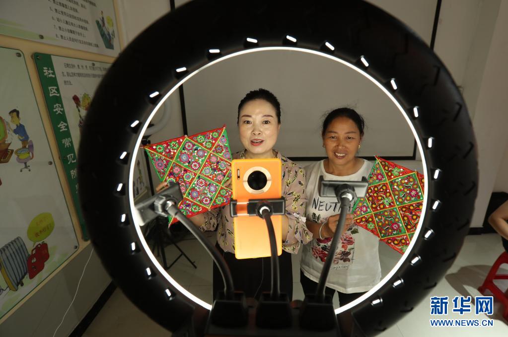 7月5日,在貴州省黔東南苗族侗族自治州榕江縣場(chǎng)壩社區(qū)服務(wù)中心網(wǎng)絡(luò)直播營(yíng)銷技能培訓(xùn)教室里,學(xué)員在直播營(yíng)銷刺繡手工藝品。新華社發(fā)(李長(zhǎng)華 攝)