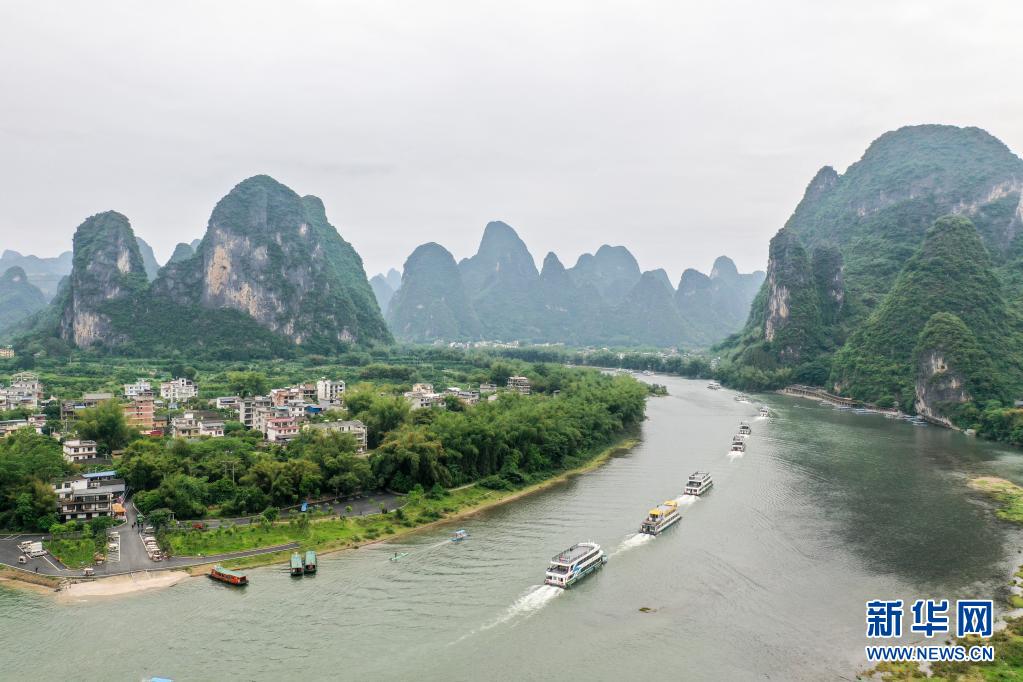 這是4月25日拍攝的漓江廣西陽朔段(無人機(jī)照片)。新華社記者 曹祎銘 攝