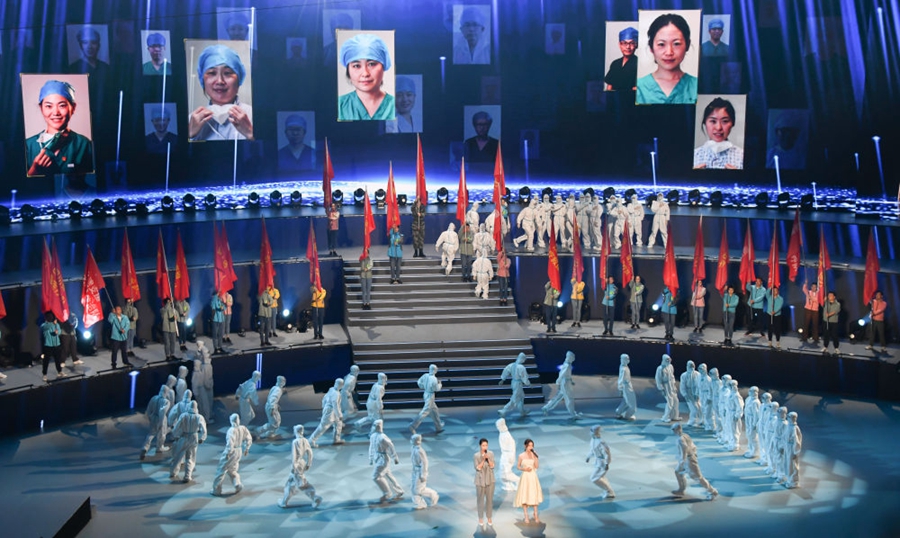2021年6月26日,在武漢舉行的湖北省慶祝中國(guó)共產(chǎn)黨成立100周年文藝晚會(huì)上再現(xiàn)抗疫英雄群像。