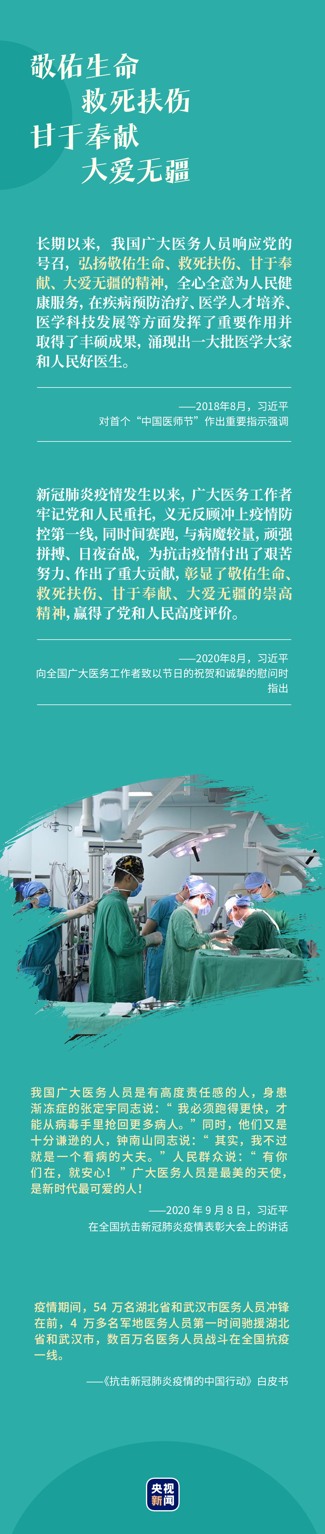 習(xí)近平總書記非常關(guān)心廣大醫(yī)務(wù)工作者,多次作出重要指示、向醫(yī)務(wù)工作者致以慰問,親切地稱贊他們?yōu)?ldquo;新時(shí)代最可愛的人”。