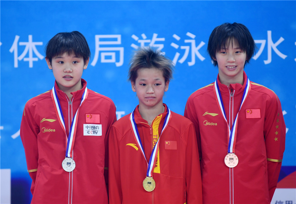 2020年10月4日,冠軍廣東海印隊選手全紅嬋(中)、亞軍北京水立方隊選手張家齊(左)和季軍上海浩沙隊選手陳芋汐在頒獎儀式上。當日,在河北奧體中心舉行的2020年全國跳水冠軍賽暨東京奧運會、世界杯預選賽女子10米跳臺決賽中,全紅嬋奪得冠軍。新華社記者 王曉 攝
