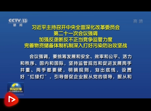 央視網(wǎng)消息(新聞聯(lián)播):中共中央總書記、國家主席、中央軍委主席、中央全面深化改革委員會主任習(xí)近平8月30日下午主持召開中央全面深化改革委員會第二十一次會議,審議通過了《關(guān)于強化反壟斷深入推進公平競爭政策實施的意見》、《關(guān)于改革完善體制機制加強戰(zhàn)略和應(yīng)急物資儲備安全管理的若干意見》、《關(guān)于深入打好污染防治攻堅戰(zhàn)的意見》、《關(guān)于更加有效發(fā)揮統(tǒng)計監(jiān)督職能作用的意見》。