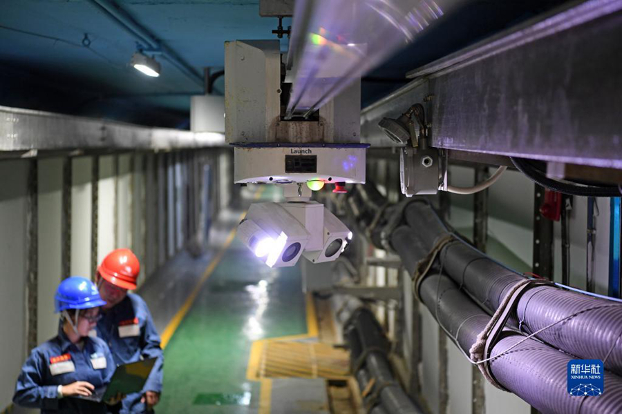 在珠海橫琴綜合管廊電力隧道里,南方電網(wǎng)工作人員操作巡檢機(jī)器人對(duì)電纜隧道動(dòng)態(tài)巡檢(2019年12月12日攝)。新華社記者 梁旭 攝