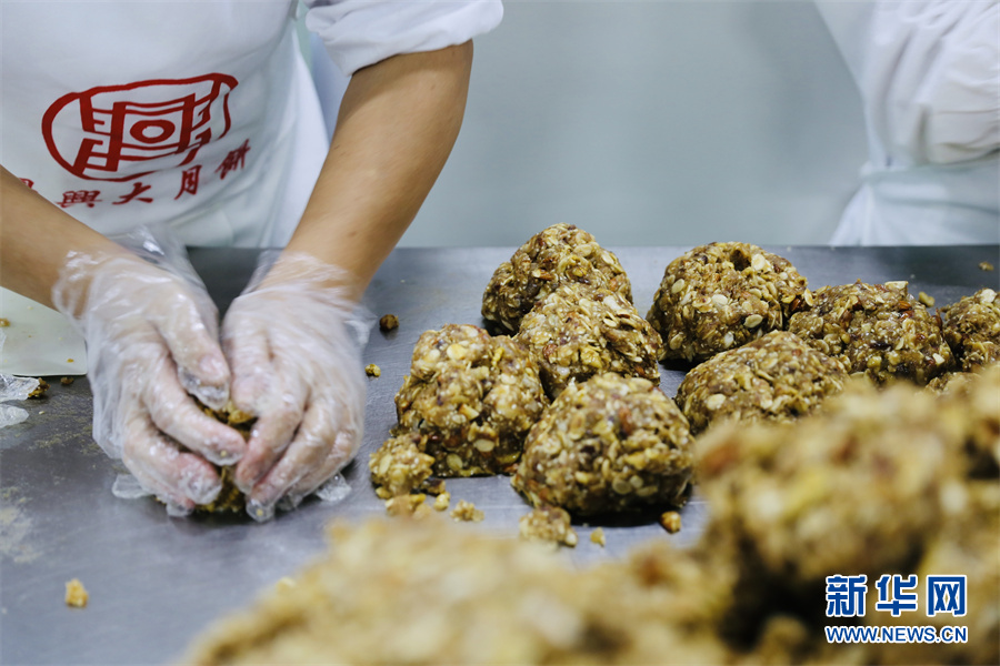 工人將月餅餡料稱重后揉捏成團。鐘涓涓 攝