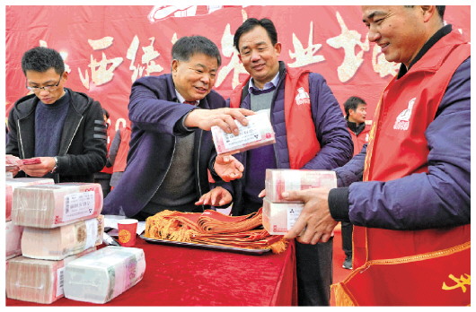 2019年1月18日,安義縣“糧王”凌繼河(右三)給農(nóng)民員工發(fā)放獎(jiǎng)金。(新華社資料片)