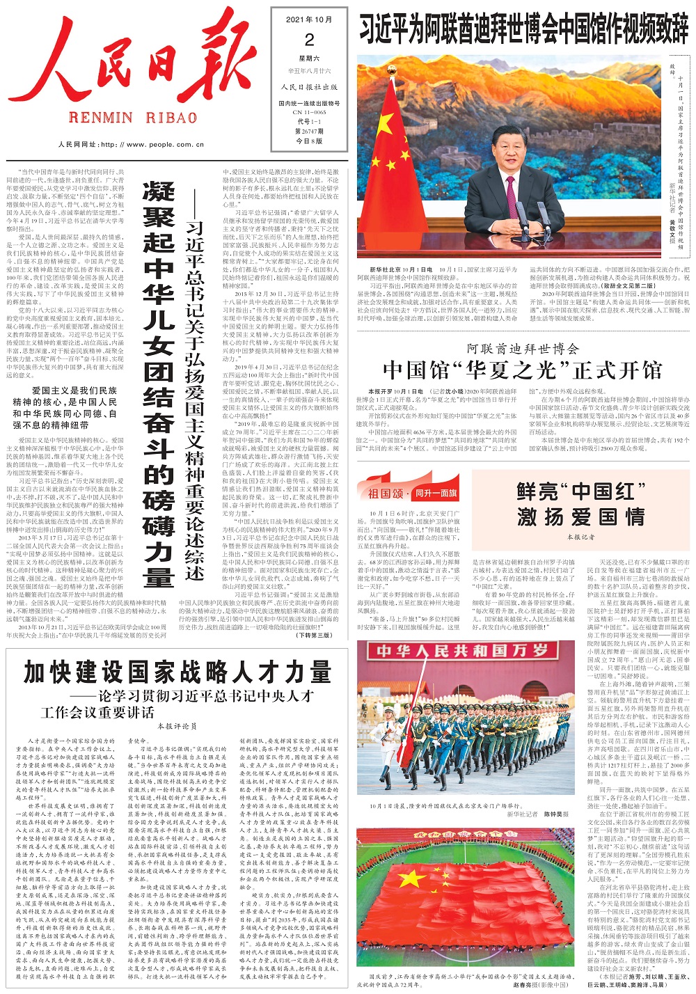 “天行健,君子以自強(qiáng)不息。”邁上全面建設(shè)社會(huì)主義現(xiàn)代化國家的壯闊征程,瞻望中華民族偉大復(fù)興的光明前景,我們無比堅(jiān)定、無比自信。團(tuán)結(jié)就是力量,團(tuán)結(jié)越緊力量越大。只要全黨全國各族人民、海內(nèi)外中華兒女同心同德、群策群力,就能形成萬眾一心、無堅(jiān)不摧的磅礴力量,就能戰(zhàn)勝一切強(qiáng)大敵人、一切艱難險(xiǎn)阻。讓我們更加緊密地團(tuán)結(jié)在以習(xí)近平同志為核心的黨中央周圍,大力弘揚(yáng)偉大愛國主義精神,向著全面建設(shè)社會(huì)主義現(xiàn)代化國家新征程,向著實(shí)現(xiàn)中華民族偉大復(fù)興的中國夢(mèng),繼續(xù)奮勇前進(jìn)!