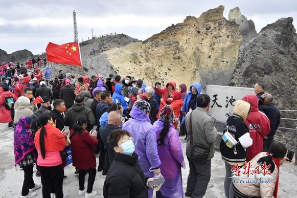 正在與天池合影留念的廣東游客賴曲禮先生激動地說:“很幸運能夠看到天池,感覺天池就像一塊藍寶石一樣。長白山的景色是一種神奇的美,空氣特別好,現(xiàn)在太陽也出來了,而且今天是祖國的生日,東方紅、太陽升,祖國萬歲,祝偉大祖國生日快樂。”