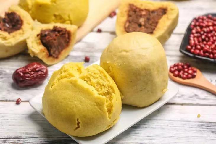 6.蒸制:水開后放上包好的黃饃饃,大火蒸約20分鐘即可。關(guān)火后不要馬上打開蓋子,悶蒸3分鐘后再打開。取出的黃饃饃晾涼后即可食用。