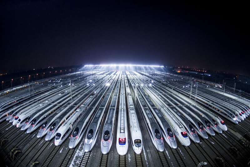 △動(dòng)車組停靠在武漢動(dòng)車段的存車線上,準(zhǔn)備進(jìn)行檢修和保溫作業(yè)(2018年2月1日攝)。