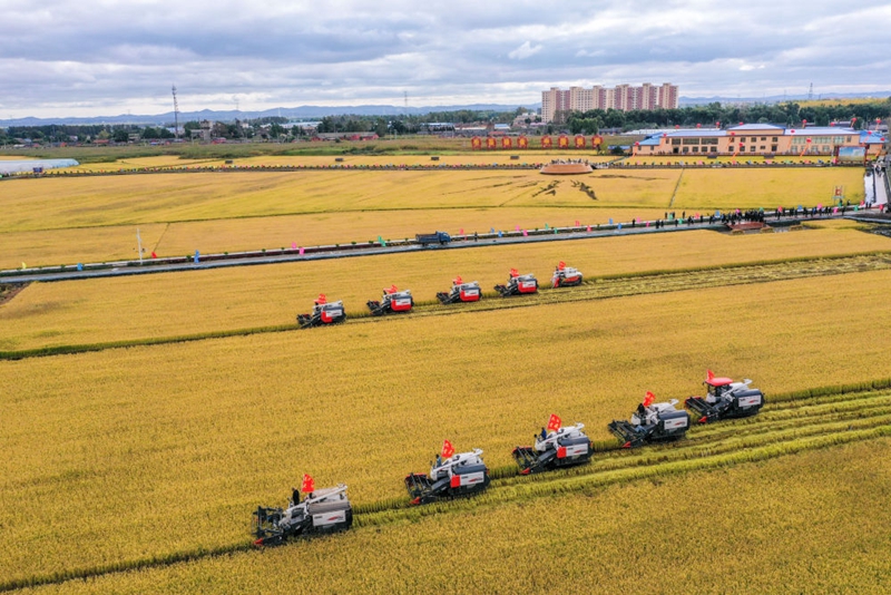 △在吉林省長(zhǎng)春市九臺(tái)區(qū)龍嘉街道紅光村,農(nóng)民駕駛農(nóng)機(jī)進(jìn)行水稻收割作業(yè)(無人機(jī)照片,2021年9月23日攝)。