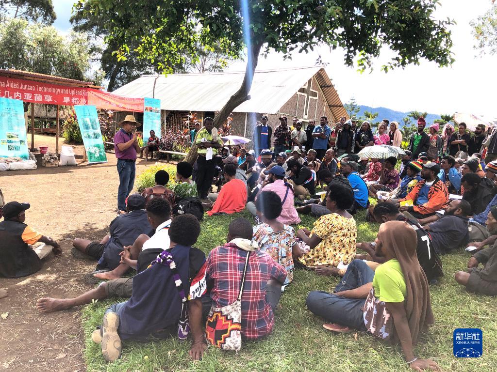 2020年12月15日,中國援巴布亞新幾內(nèi)亞菌草旱稻項(xiàng)目專家組組長林應(yīng)興(戴草帽者)在巴布亞新幾內(nèi)亞東高地省中國援助巴新菌草和旱稻技術(shù)項(xiàng)目第9期培訓(xùn)班上授課。新華社發(fā)