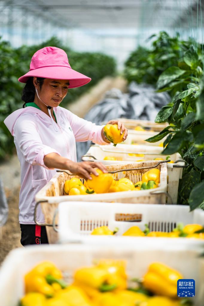 村民在貴陽農(nóng)投集團奇申蔬菜基地采收牛角椒(7月29日攝)。新華社記者 陶亮 攝