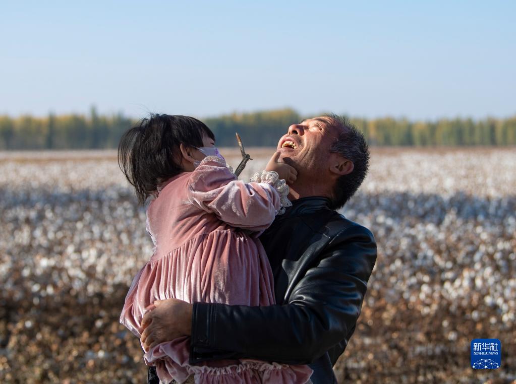周末,家住市區(qū)的小孫女來(lái)到正在采收的棉田玩耍,陸高林抱起孫女逗樂(10月24日攝)。新華社記者 胡虎虎 攝