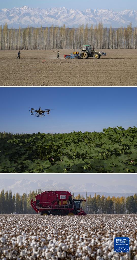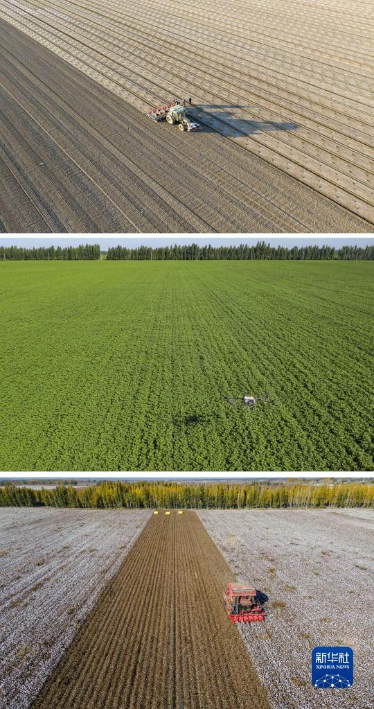 拼版照片:上圖為春播時(shí)節(jié),陸高林父子和雇來(lái)的工人一起操作機(jī)械在棉田里播種(4月15日攝);中圖為夏季田間管理時(shí),農(nóng)業(yè)植保無(wú)人機(jī)在陸高林家的棉田里打藥(7月15日攝);下圖為秋收時(shí)節(jié),陸高林雇來(lái)的采棉機(jī)在棉田里采收棉花(10月24日攝)。新華社記者 胡虎虎 攝