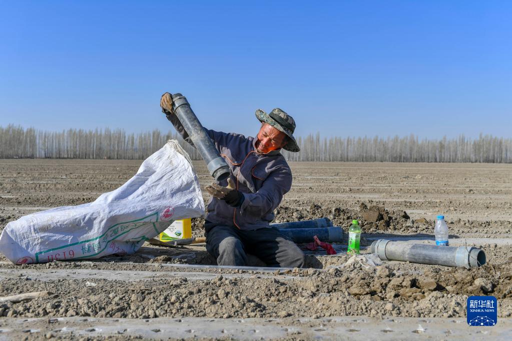 陸高林在一片已播種的棉地里清理滴管管道設(shè)備,為出苗時(shí)的水肥供給做準(zhǔn)備(4月15日攝)。新華社記者 胡虎虎 攝