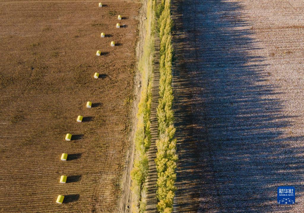 這是在新疆塔城地區(qū)沙灣市大泉鄉(xiāng)三道溝村拍攝的陸高林家的棉田(10月24日攝,無(wú)人機(jī)照片)。畫面左側(cè)為已采收的棉田,棉包擺放在地上,待價(jià)格合適時(shí),這些棉包將被運(yùn)往軋花廠售賣;右側(cè)為待采收的地塊。新華社記者 胡虎虎 攝