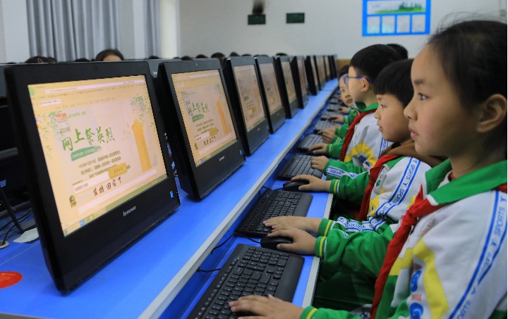 2019年4月3日,湖南吉首大學師范學院附屬小學的學生們參加網(wǎng)上祭英烈活動。新華社發(fā)(彭彪 攝)