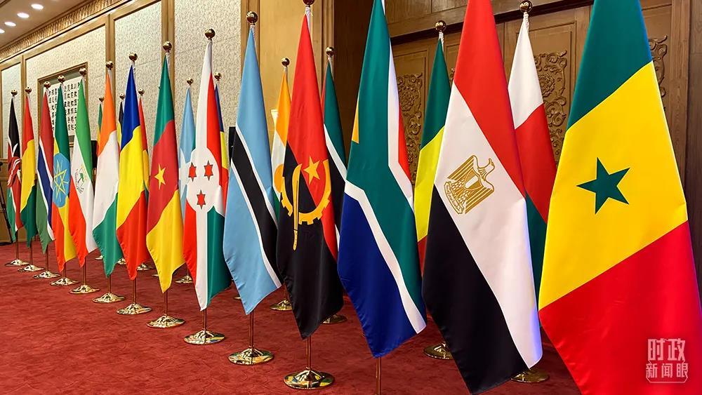 △東大廳內(nèi),中國和53個(gè)非洲國家國旗以及非洲聯(lián)盟旗幟組成的旗陣。(總臺(tái)央視記者范一鳴拍攝)