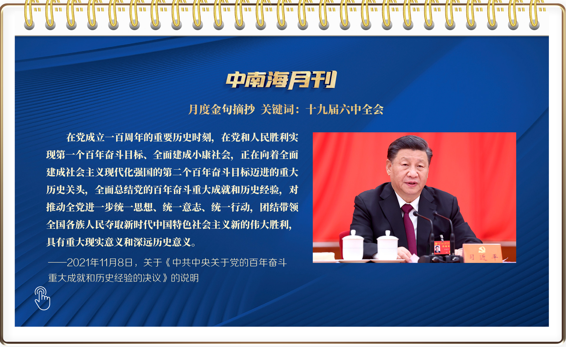 這個(gè)月,中國(guó)共產(chǎn)黨第十九屆中央委員會(huì)第六次全體會(huì)議(以下簡(jiǎn)稱十九屆六中全會(huì))在京召開,習(xí)近平總書記作重要講話。全會(huì)審議通過(guò)了《中共中央關(guān)于黨的百年奮斗重大成就和歷史經(jīng)驗(yàn)的決議》,《決議》總結(jié)了黨團(tuán)結(jié)帶領(lǐng)人民群眾百年奮斗的重大歷史成就,凝聚起向第二個(gè)百年奮斗目標(biāo)奮進(jìn)的強(qiáng)大力量。