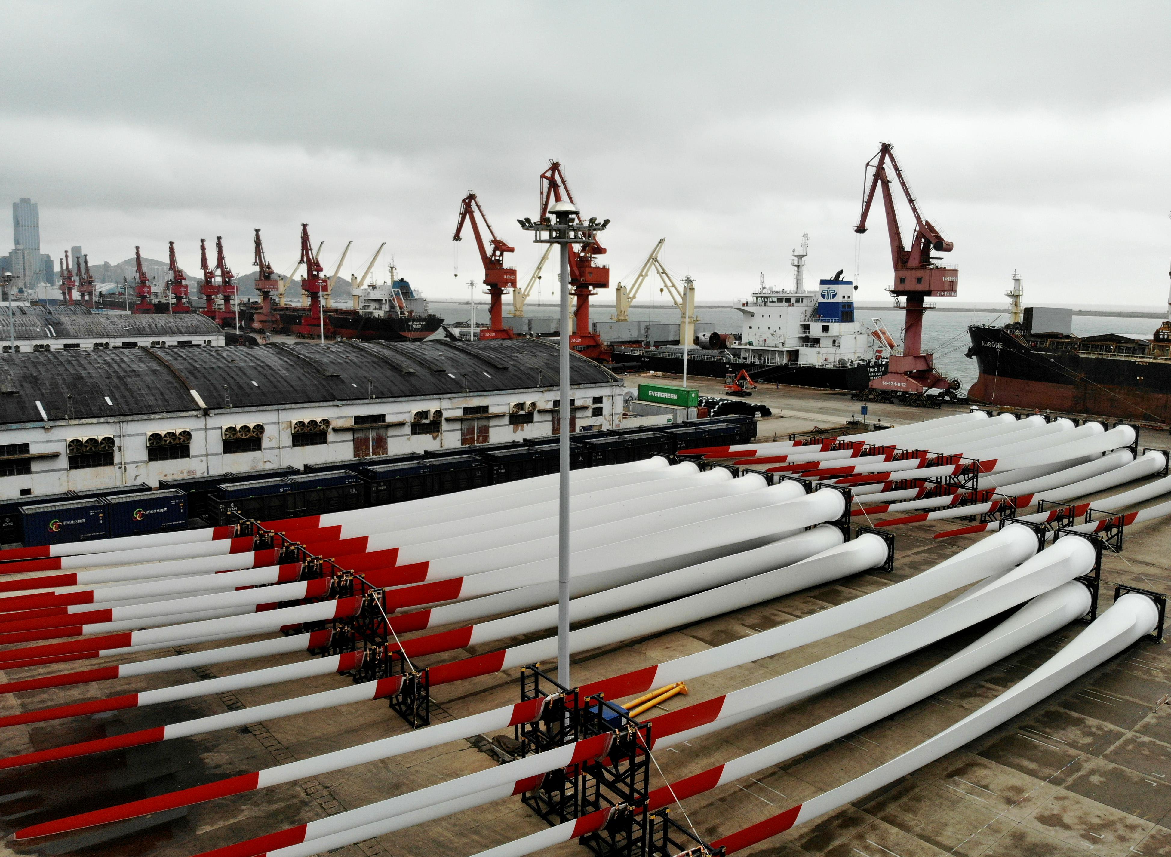 一批風電葉片排放在江蘇連云港一碼頭等待裝船(7月27日攝,無人機照片)。新華社發(fā)(王春 攝)