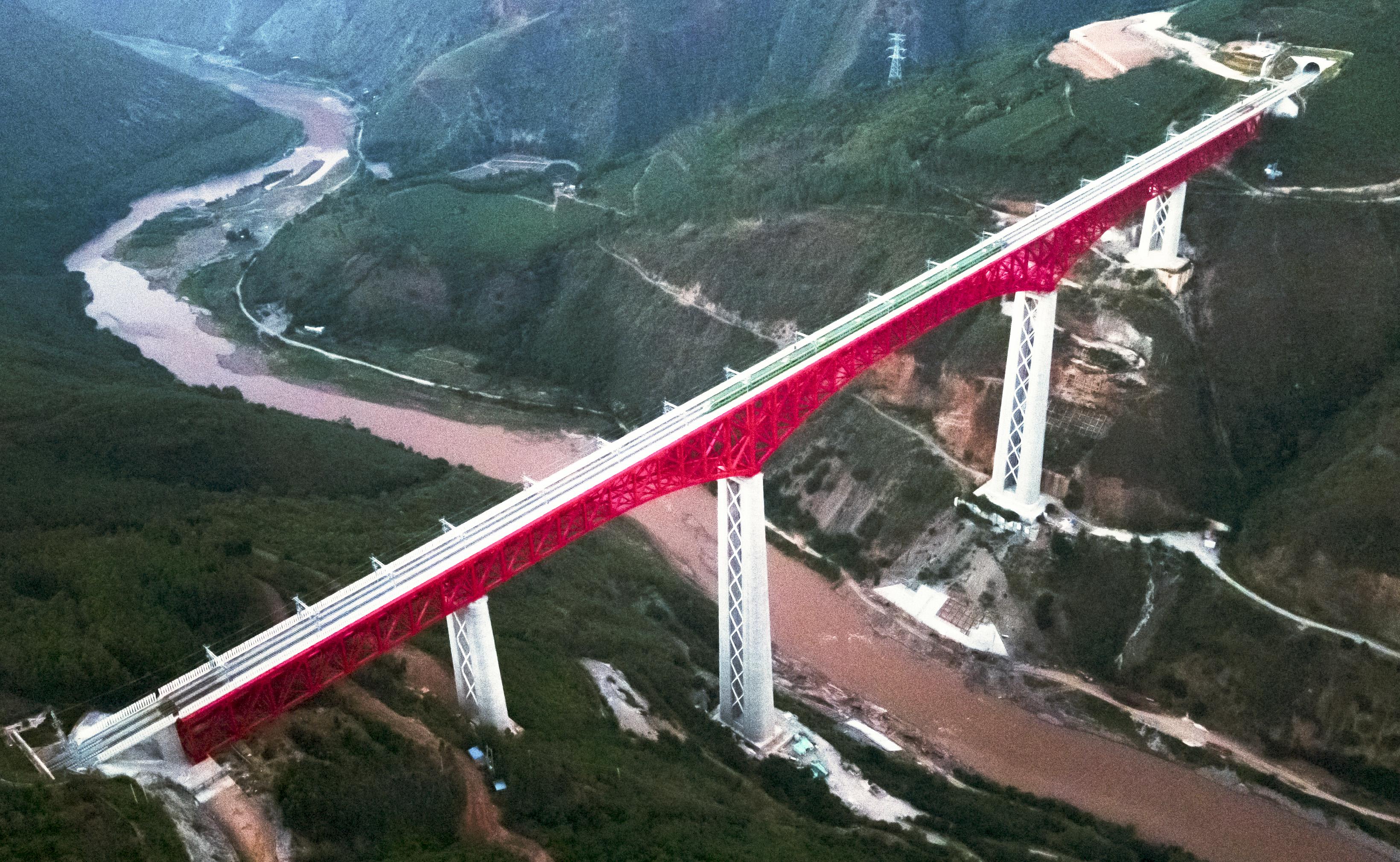 中老鐵路首發(fā)列車駛過中國云南省元江哈尼族彝族傣族自治縣境內(nèi)的元江雙線特大橋(12月3日攝,無人機照片)。新華社記者 王冠森 攝