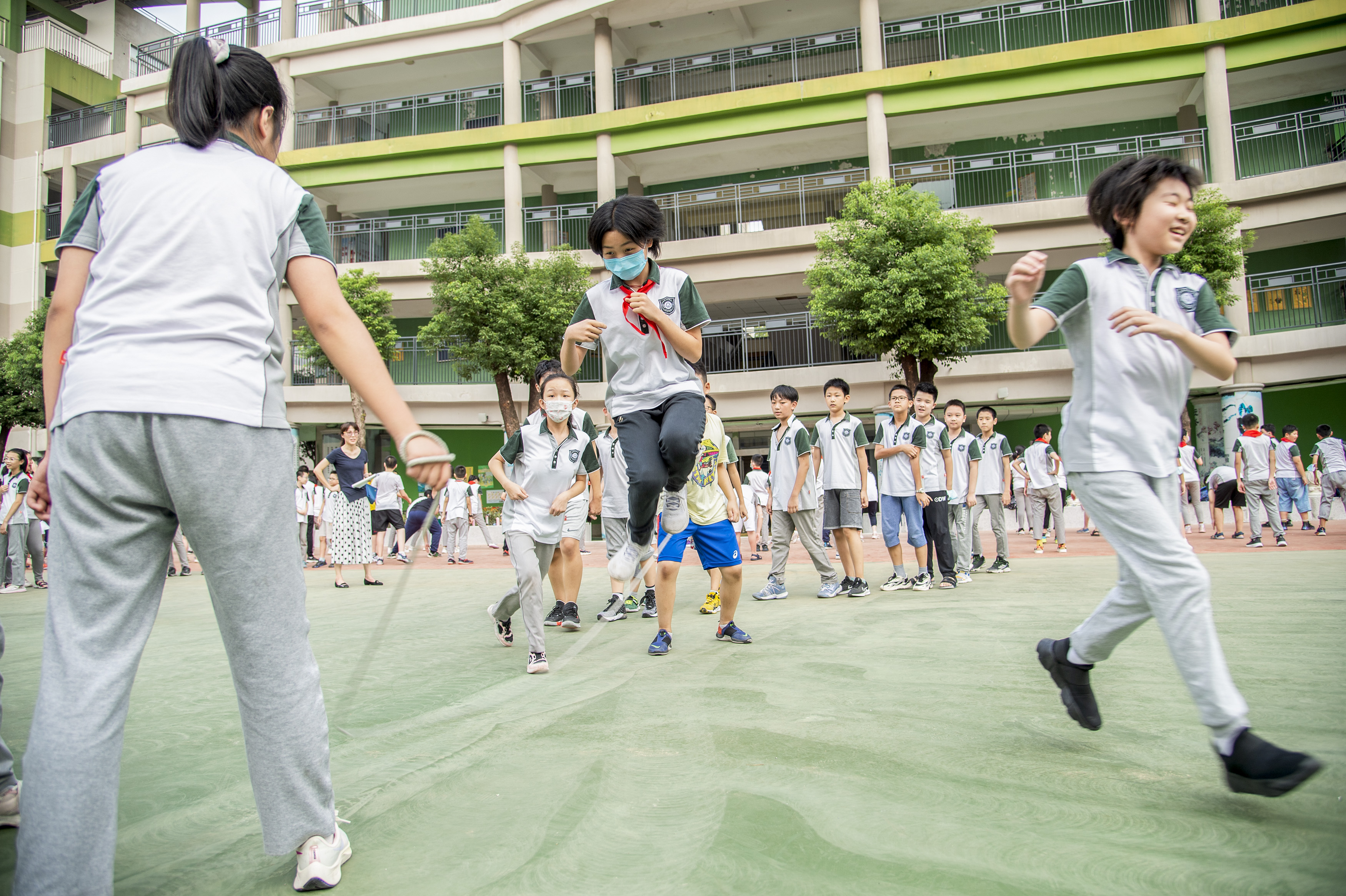 湖北省武昌水果湖第一小學的學生在操場上跳繩鍛煉(9月1日攝)。新華社發(fā)(伍志尊 攝)