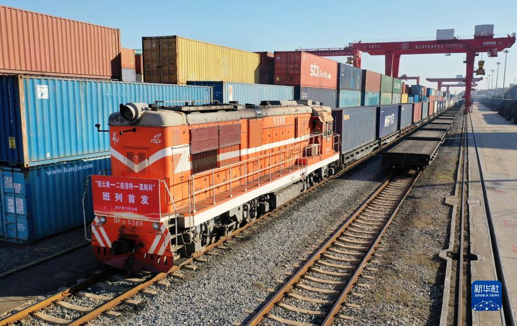 “連云港—二連浩特—莫斯科”中歐班列在江蘇連云港中哈物流基地整裝待發(fā)(11月23日攝,無人機照片)。新華社發(fā)(王健民 攝)