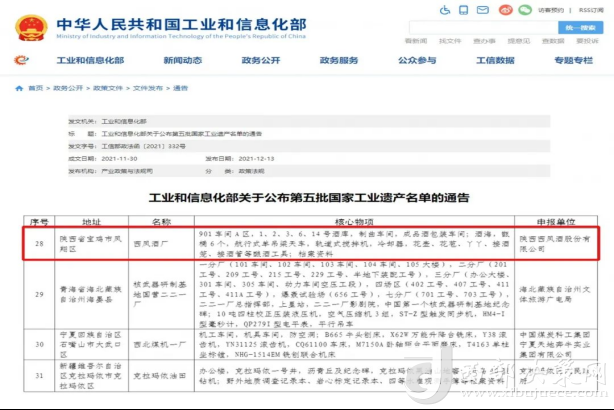 西部決策網(wǎng)訊(韓宗憲)12月13日,工業(yè)和信息化部公布了第五批國(guó)家工業(yè)遺產(chǎn)名單,西鳳酒釀酒工業(yè)遺產(chǎn)群作為唯一的中國(guó)白酒生產(chǎn)釀造項(xiàng)目同全國(guó)其他30家工業(yè)遺產(chǎn)一起進(jìn)入名單。這也是繼6月10日國(guó)家級(jí)非物質(zhì)文化遺產(chǎn)榜單發(fā)布以來,西鳳榮列的又一重磅國(guó)家級(jí)名單。既標(biāo)志了相關(guān)部門和廣大消費(fèi)者對(duì)三千年無斷代西鳳酒釀造設(shè)備和釀造技藝的肯定,也表示出西鳳酒為中國(guó)白酒發(fā)展作出的突出貢獻(xiàn)。