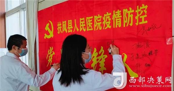 為全力做好汽車站疫情防控工作,院黨總支向全院黨員發(fā)出動員倡議書,職能、臨床內(nèi)科、臨床外科和醫(yī)技黨支部迅速響應,積極動員。11月23日下午,全體黨員在院多功能廳面對黨旗莊嚴宣誓:“自愿加入疫情防控黨員先鋒隊,堅決以行動譜寫忠誠,用實干詮釋擔當,堅守崗位,盡職盡責,不畏懼、不退縮、不計得失,全力以赴阻擊疫情,守護人民群眾的生命健康”。隨后,院黨總支書記、院長馬忠科,副書記、副院長蘇長岐,支委委員王文輝、趙軒弘、張軍強、陳文博等院領導帶頭在先鋒隊隊旗上簽名許下了“愛的諾言”。