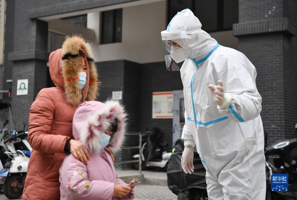 12月27日,在西安市雁塔區(qū)孟村小區(qū),盧晨陽(右)向居民介紹核酸檢測注意事項(xiàng)。新華社記者 張博文 攝