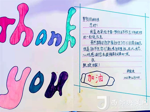 三九嚴冬,雪花紛飛,寒風(fēng)刺骨。12月24日,一大早,我和隊員們早早到指定地點集合,等待分配任務(wù)。看到護理姐妹們個個兒都精神飽滿、整裝待發(fā),我的心情是又緊張又激動。當我們到達任務(wù)采集地點時,社區(qū)工作人員和志愿者同志為我們搭建了一個簡易帳篷。帳篷四翼隨風(fēng)飄揚,凜冽的寒風(fēng)襲進帳篷,如同置身風(fēng)口一樣。一切準備就緒,換上防護用品,立即開展工作。室外溫度達零下五度,我們認真地為每位居民采集核酸。采集完核酸后,做到一人一消,隊員的手都凍得通紅麻木,已經(jīng)感覺不到疼痛,面屏上都已經(jīng)霧氣籠罩,但是,隊員們沒有一個人喊累、沒有一個人退縮,更沒有一個人喊停。這時,耳畔傳來一聲,“孩子,辛苦了,這是我給你們送的熱水,” “我家有熱寶,給你們?nèi)∪∨?rdquo;“姐姐,謝謝你們,”說著,一個小女孩走過來,送來兩張自己做的小賀卡,上面寫的都是感謝的話語。