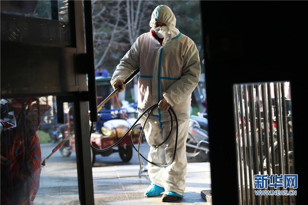 2022年1月1日清晨,西安市浐灞生態(tài)區(qū)一小區(qū)內(nèi),工作人員正在為小區(qū)內(nèi)樓道進行消殺。新華網(wǎng) 王智超攝