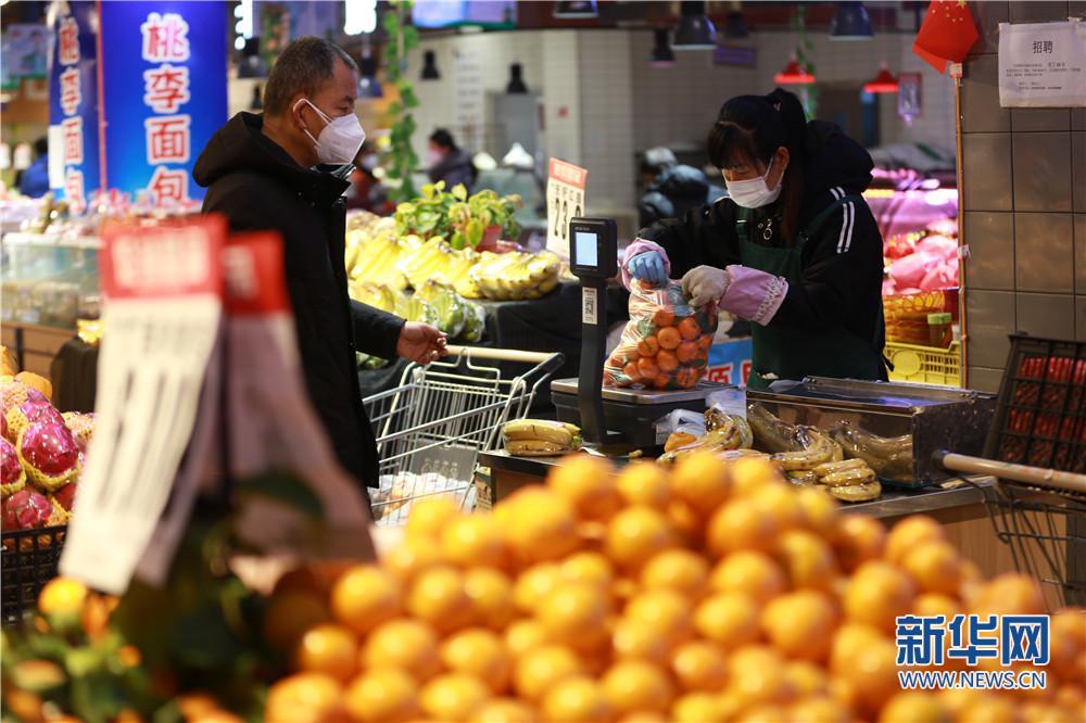 2022年1月1日,西安市浐灞生態(tài)區(qū)一小區(qū)內(nèi),市民正在小區(qū)內(nèi)的超市中選購水果。新華網(wǎng) 王智超攝