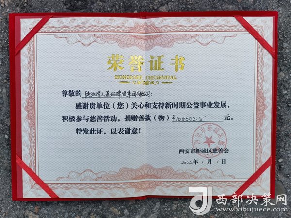 西安市新城區(qū)慈善協(xié)會(huì)向陜建基礎(chǔ)集團(tuán)頒發(fā)支持公益事業(yè)發(fā)展,積極參與慈善活動(dòng)的榮譽(yù)證書。