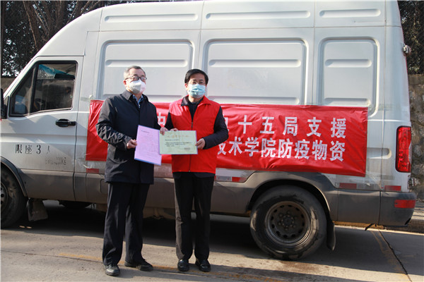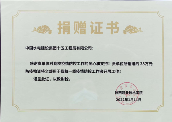 1月11日下午15:00,在陜西職業(yè)技術(shù)學(xué)院舉行簡短捐贈儀式,陜西職業(yè)技術(shù)學(xué)院黨委副書記、院長劉勝輝,黨委副書記、紀(jì)委書記何軍,副院長王慶等參加了捐贈儀式。劉勝輝代表學(xué)院黨委向我公司表示感謝,他表示,在疫情防控的關(guān)鍵時刻,水電十五局一周內(nèi)2批次送來價值近28萬元生活物資,及時緩解更極大充實和豐富了我校抗疫生活物資,為我院師生樹立了光輝榜樣,堅定了共克時艱的信心和決心。何軍向公司黨委副書記、紀(jì)委書記、工會主席任志宏贈送了捐款證明和感謝信。任志宏表示,水電十五局作為駐陜央企,一直以來,堅決貫徹落實黨中央決策部署,主動響應(yīng)陜西省委組織部和省國資委號召,面對此次疫情,將積極踐行央企擔(dān)當(dāng),履行社會責(zé)任,用實際行動為西安高校疫情防控貢獻一份力量!