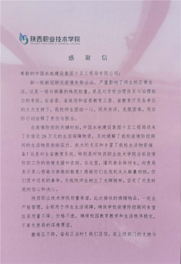 “感謝貴單位在關(guān)鍵時期雪中送炭,于危急關(guān)頭解囊相助……這是對陜西省教育系統(tǒng)、特別是陜西職業(yè)技術(shù)學(xué)院疫情防控工作的熱情支援和資助!”