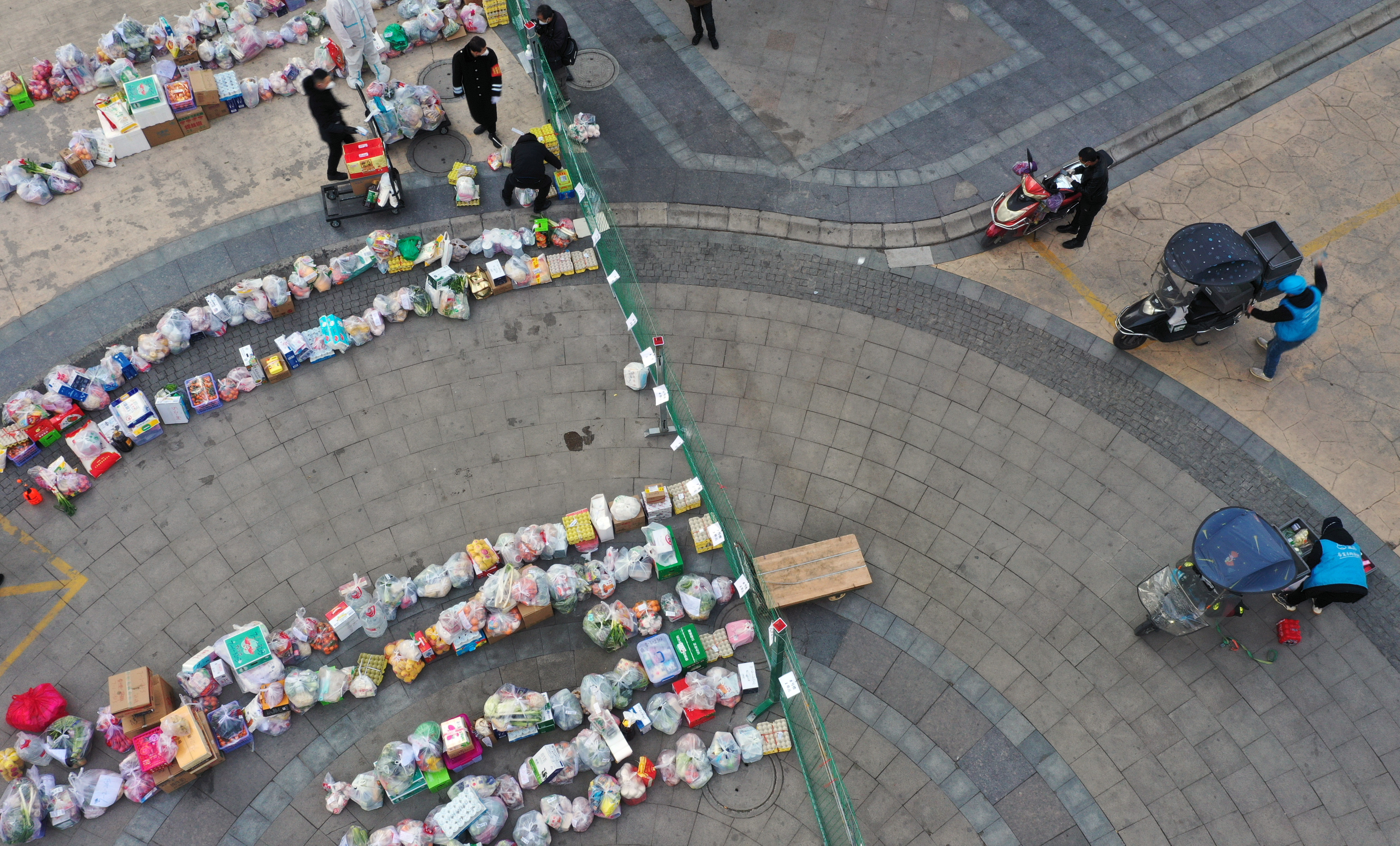 1月12日,下沉干部和志愿者在社區(qū)門(mén)前小廣場(chǎng)接收居民線上購(gòu)買(mǎi)的生活物資(無(wú)人機(jī)照片)。