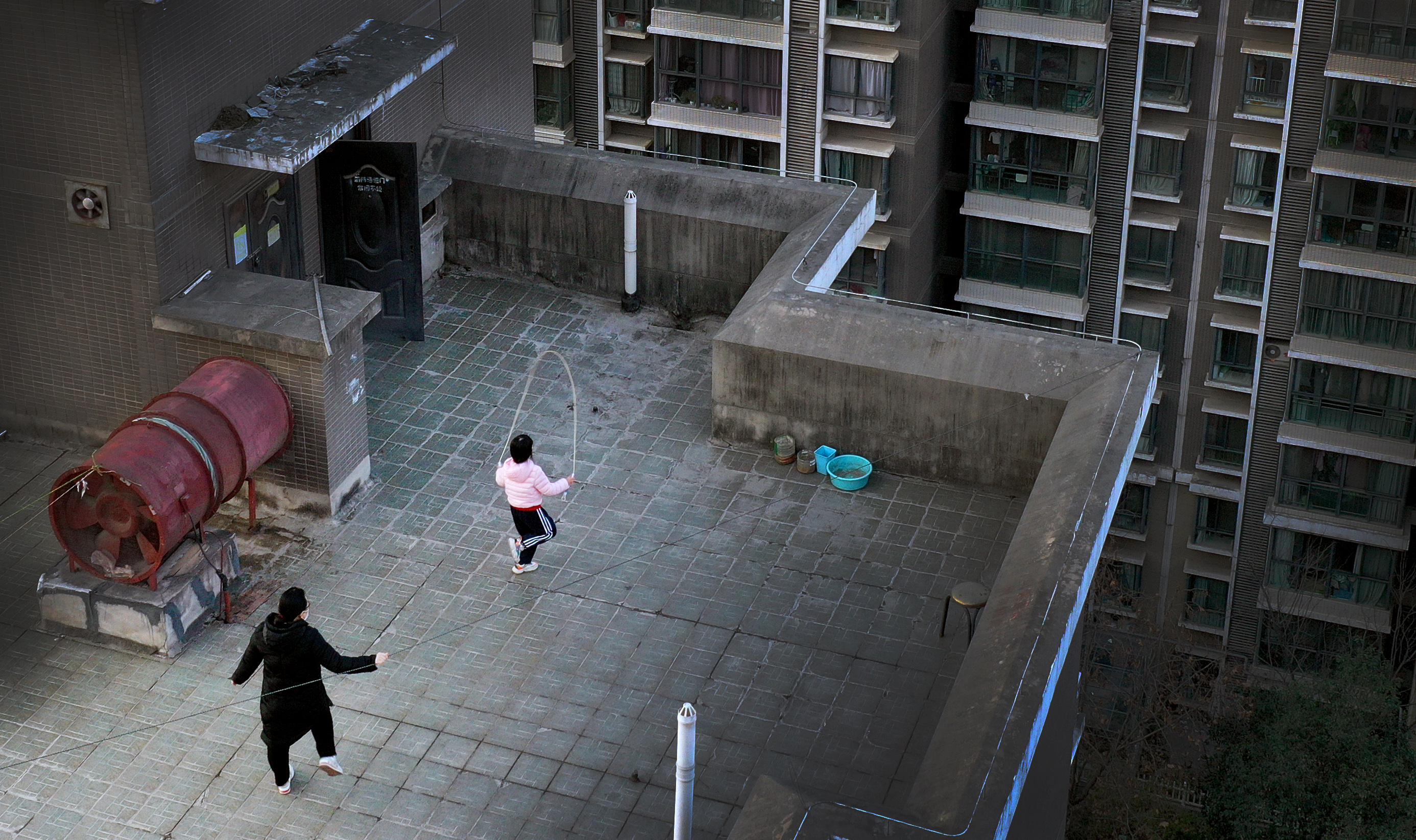 1月14日,西安市一小區(qū)居民在樓頂上跳繩鍛煉(無人機照片)。新華社記者 陶明 攝