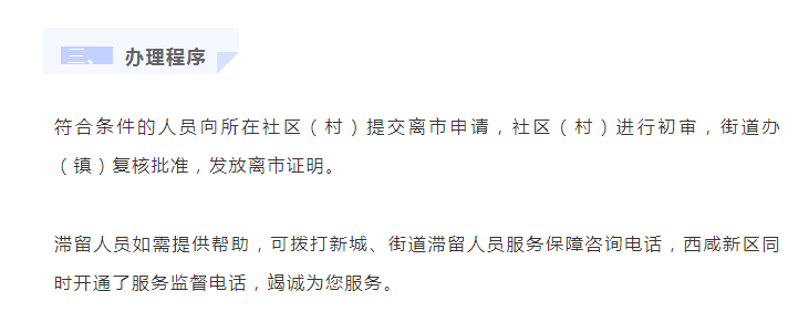 符合條件的人員向所在社區(qū)(村)提交離市申請,社區(qū)(村)進(jìn)行初審,街道辦(鎮(zhèn))復(fù)核批準(zhǔn),發(fā)放離市證明。