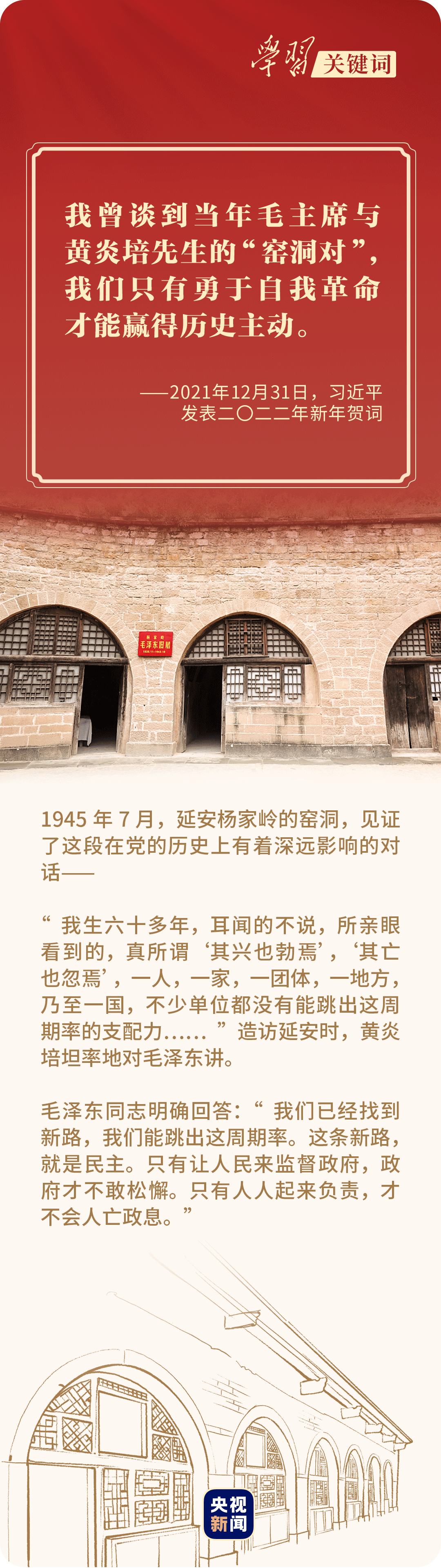 2021年11月11日,在黨的十九屆六中全會(huì)上,習(xí)近平總書記給出新解:“毛澤東同志在延安的窯洞里給出了第一個(gè)答案,這就是‘只有讓人民來監(jiān)督政府,政府才不敢松懈’。經(jīng)過百年奮斗特別是黨的十八大以來新的實(shí)踐,我們黨又給出了第二個(gè)答案,這就是自我革命。”