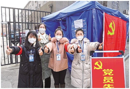 1月19日,在西安市新城區(qū)新民社區(qū),防疫保障人員豎起大拇指相互鼓勁。新華社記者陶明攝