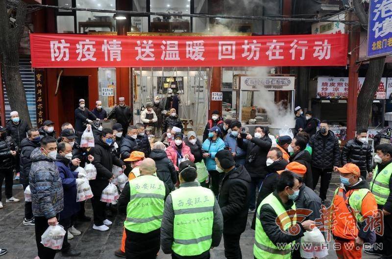 在回民街回坊老孫家泡饃店,服務(wù)員正在給周邊環(huán)衛(wèi)工免費(fèi)提供午飯。“自疫情嚴(yán)控以來,我們每天為周邊參加一線防疫工作者近千份清真熟食,以感謝他們對(duì)西安市防疫做出的貢獻(xiàn)。”該店負(fù)責(zé)人說。