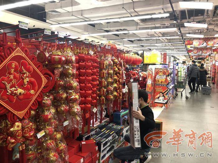 記者體驗(yàn)了一下,超市嚴(yán)格落實(shí)防疫要求,顧客掃碼,憑綠碼進(jìn)入。超市門口,有燈籠、“福”字等年貨。超市播著過年喜慶的音樂,貨物齊全,市民們在有序購物,工作人員正在給部分貨物加貨。