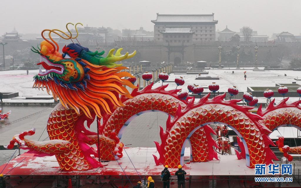 1月23日,施工人員在西安市南門廣場(chǎng)組裝龍鳳吉祥燈飾。