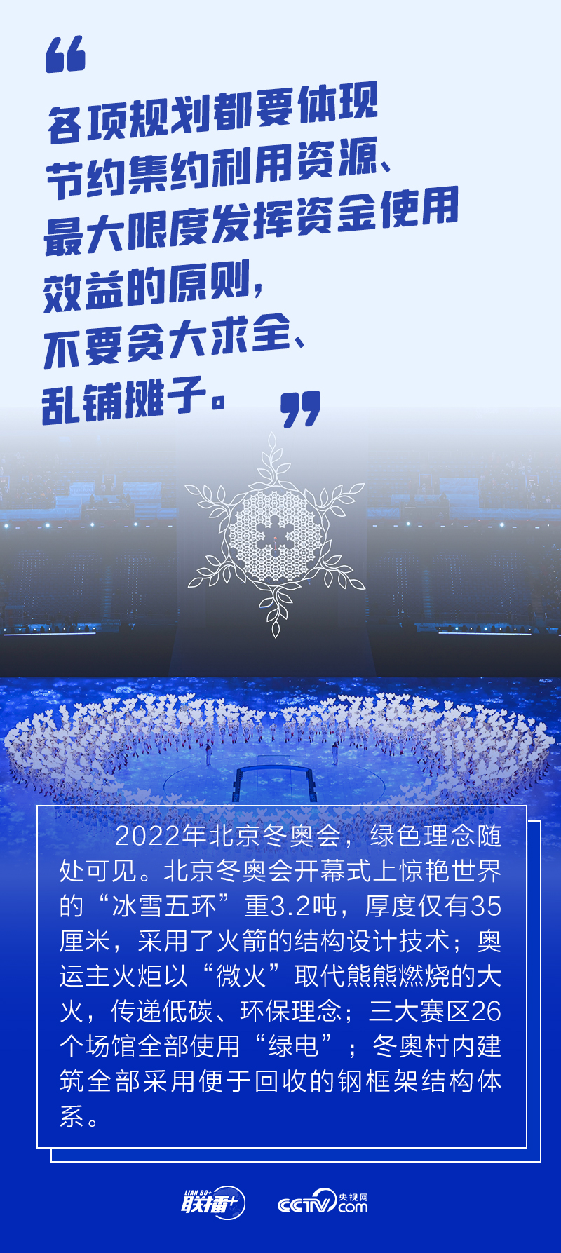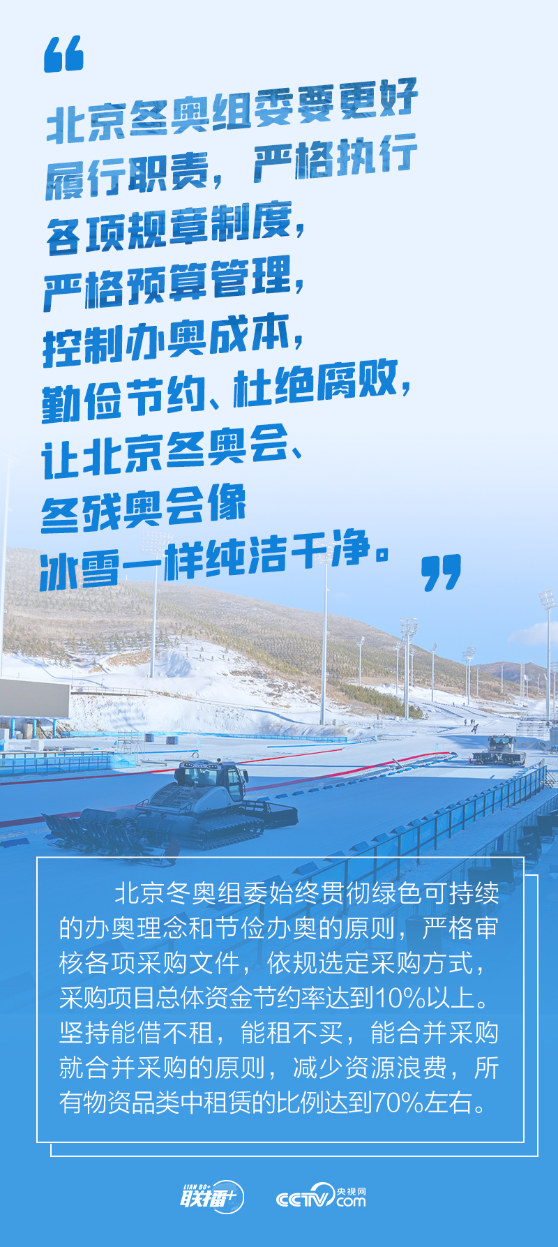冬奧會籌辦過程中,總書記始終嚴格要求把勤儉節(jié)約作為“廉潔辦奧”的重要內(nèi)容。2021年1月20日召開的會議進一步提出要做好簡化辦賽工作,從實際出發(fā),精簡非必要環(huán)節(jié)、活動和人員數(shù)量。