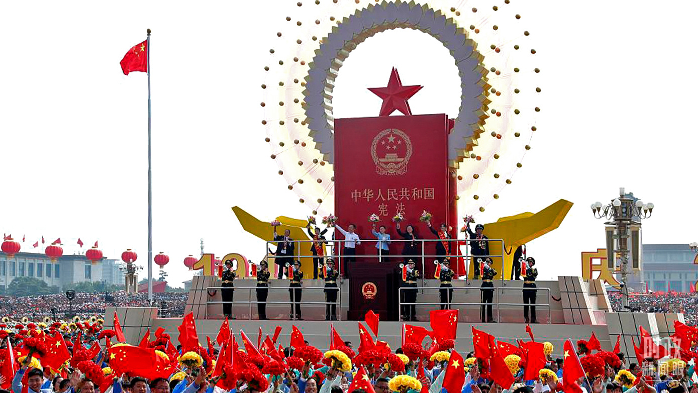 △2019年10月1日,慶祝中華人民共和國(guó)成立70周年大會(huì)現(xiàn)場(chǎng),這是群眾游行中的“民主法治”方陣。(圖/視覺中國(guó))