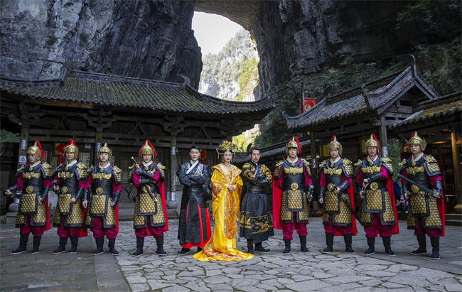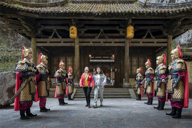 “女王駕到”“恭迎女王陛下”“諸位請起,游玩到此,觀景甚美,諸位與我,共享此景。”在天生三橋景區(qū)天福官驛客棧,一群身形魁梧的帶刀侍衛(wèi),整齊的站在驛站門口兩側(cè)恭迎每位入園的“女王”。現(xiàn)場儀式感爆棚,一身金黃的“女王”霸氣外露。驛站內(nèi)熱鬧的氛圍吸引了眾多游客參與,有的上前與侍衛(wèi)互動(dòng)拍照,有的主動(dòng)穿上“女王”服體驗(yàn)霸氣女王范,有的還主動(dòng)表演起了電影里女王翻牌的有趣橋段。“今天我最大,這樣過節(jié)著實(shí)過癮”玩得正起勁的劉女士表示,這是她過得最好玩、最具儀式感的女王節(jié)。