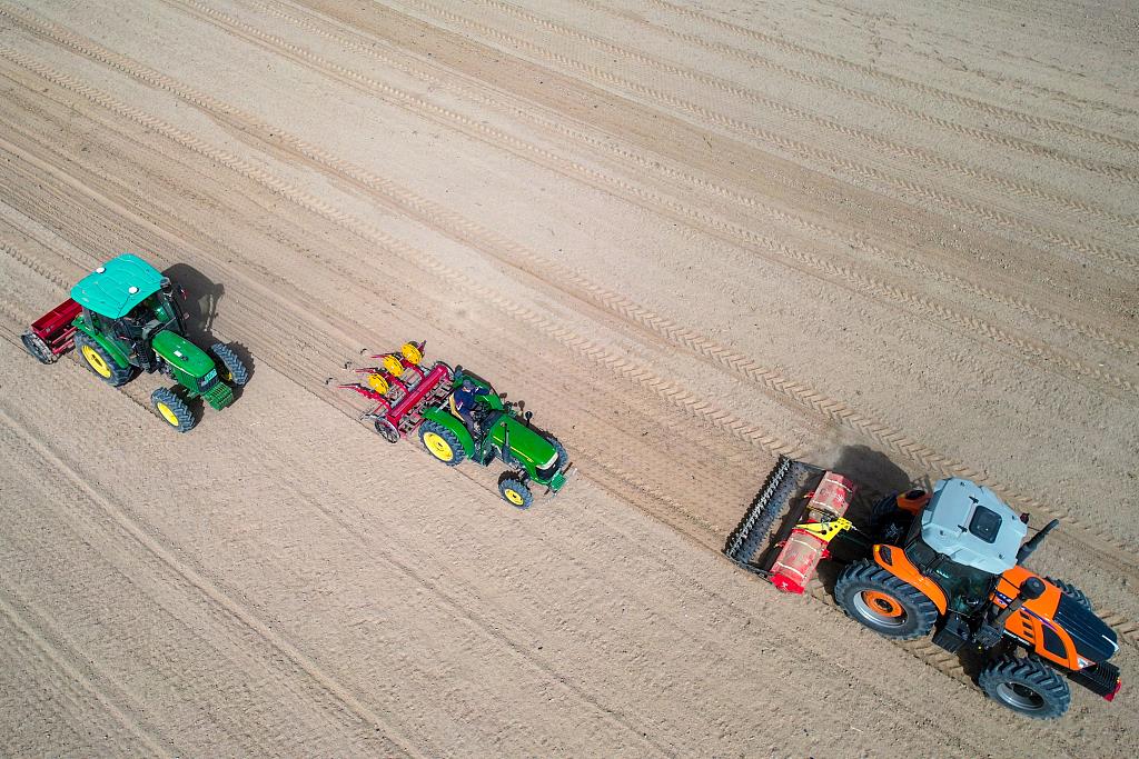 △2022年3月,寧夏吳忠,運(yùn)用北斗導(dǎo)航無人駕駛播種技術(shù),紅寺堡鎮(zhèn)一生產(chǎn)基地開展滴灌節(jié)水千畝春小麥播種。